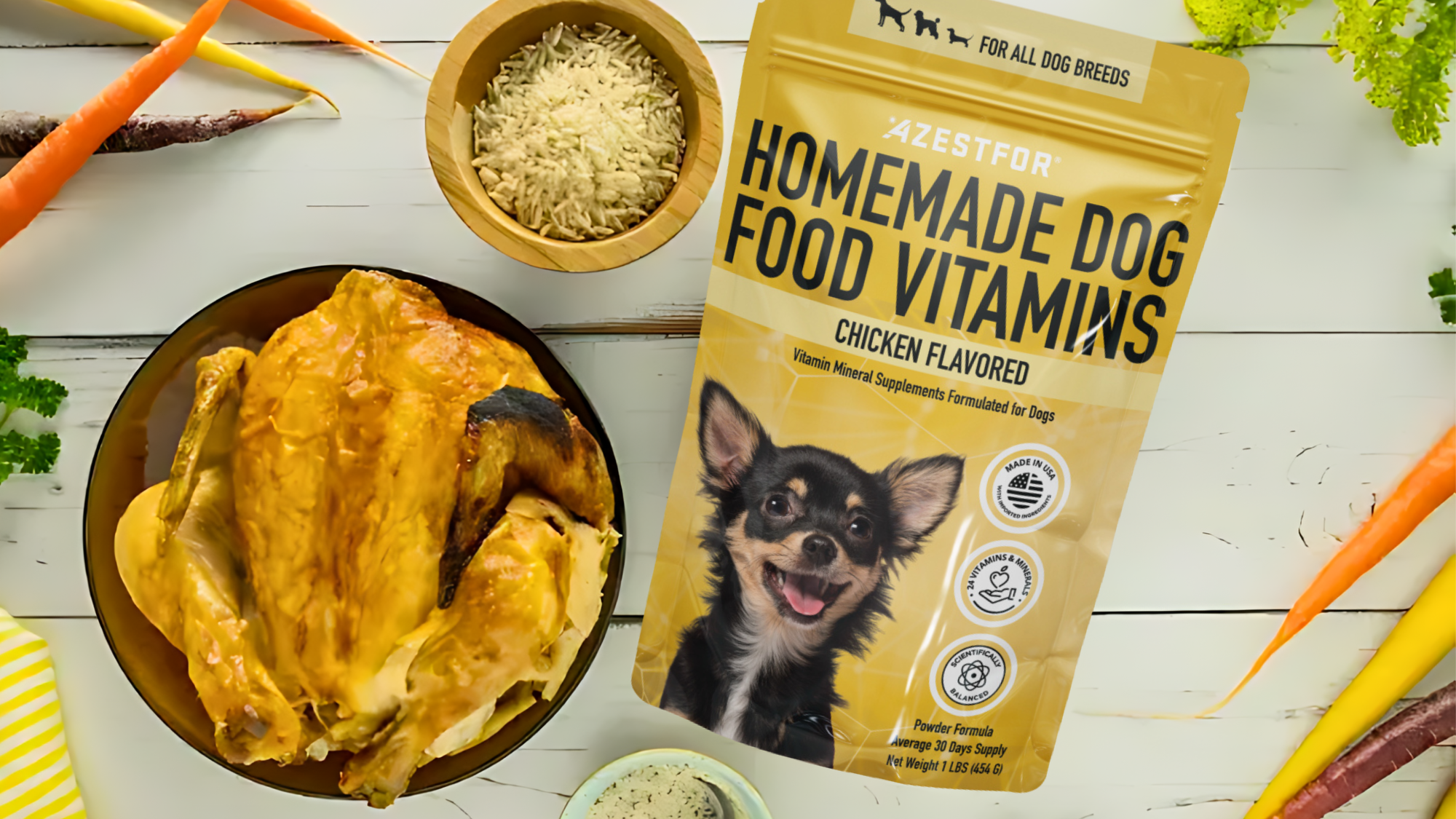 Our homemade dog food recipes with vitamins and supplements have been scientifically developed to meet AFFCO’s standards, make your homemade dog food nutritionally complete, and will provide your dog’s body with the nourishment s/he craves, so you can live your best life together!