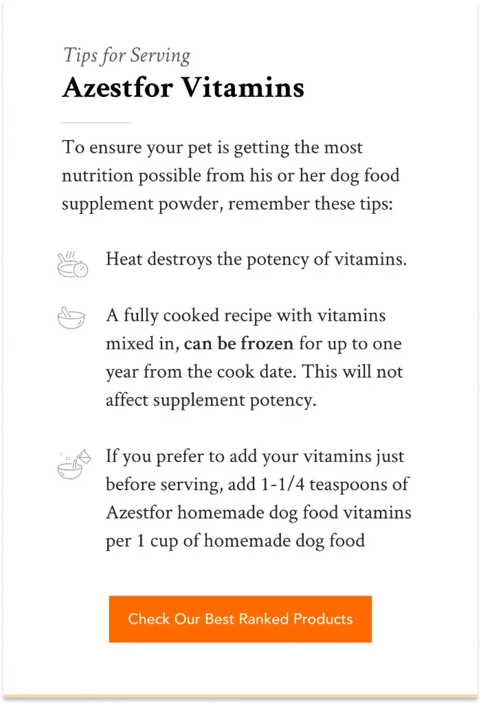When the chicken, rice and carrots are cool to enough to touch, you can add Azestfor vitamin mix for homemade dog food to make this recipe nutritionally balanced.