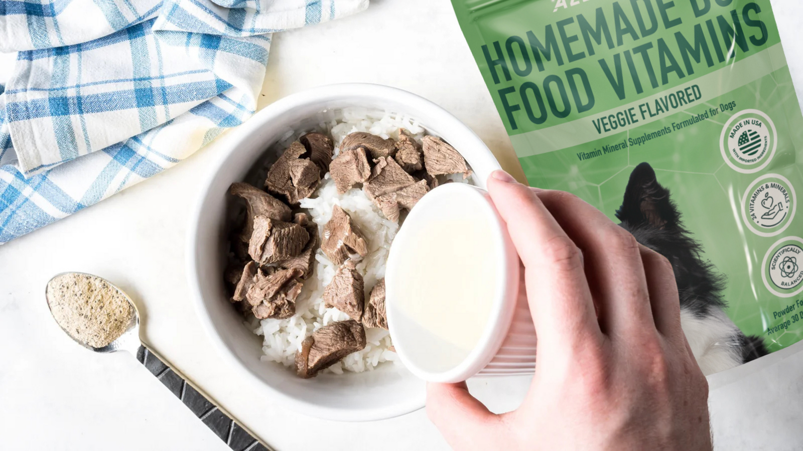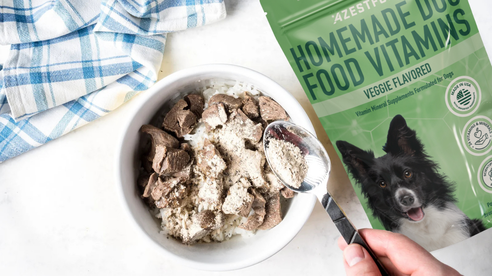 - If you prefer to add your vitamins just before serving, add 1-1/4 teaspoons of Azestfor homemade dog food vitamins per 1 cup of homemade dog food.
