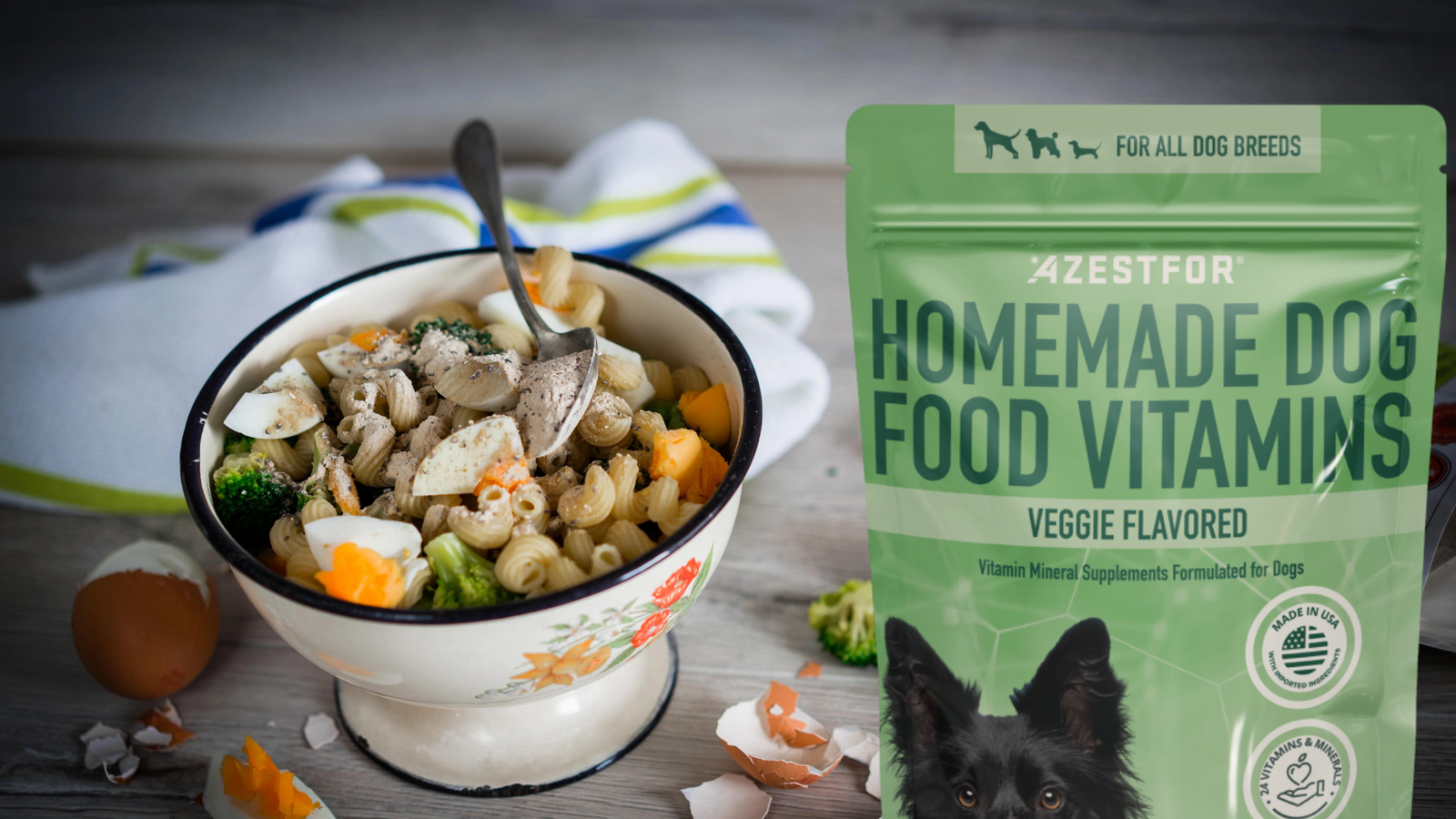 When the eggs, pasta and broccoli are cool to touch, add Azestfor vitamin mix for homemade dog food to this easy homemade recipe with eggs, and serve.