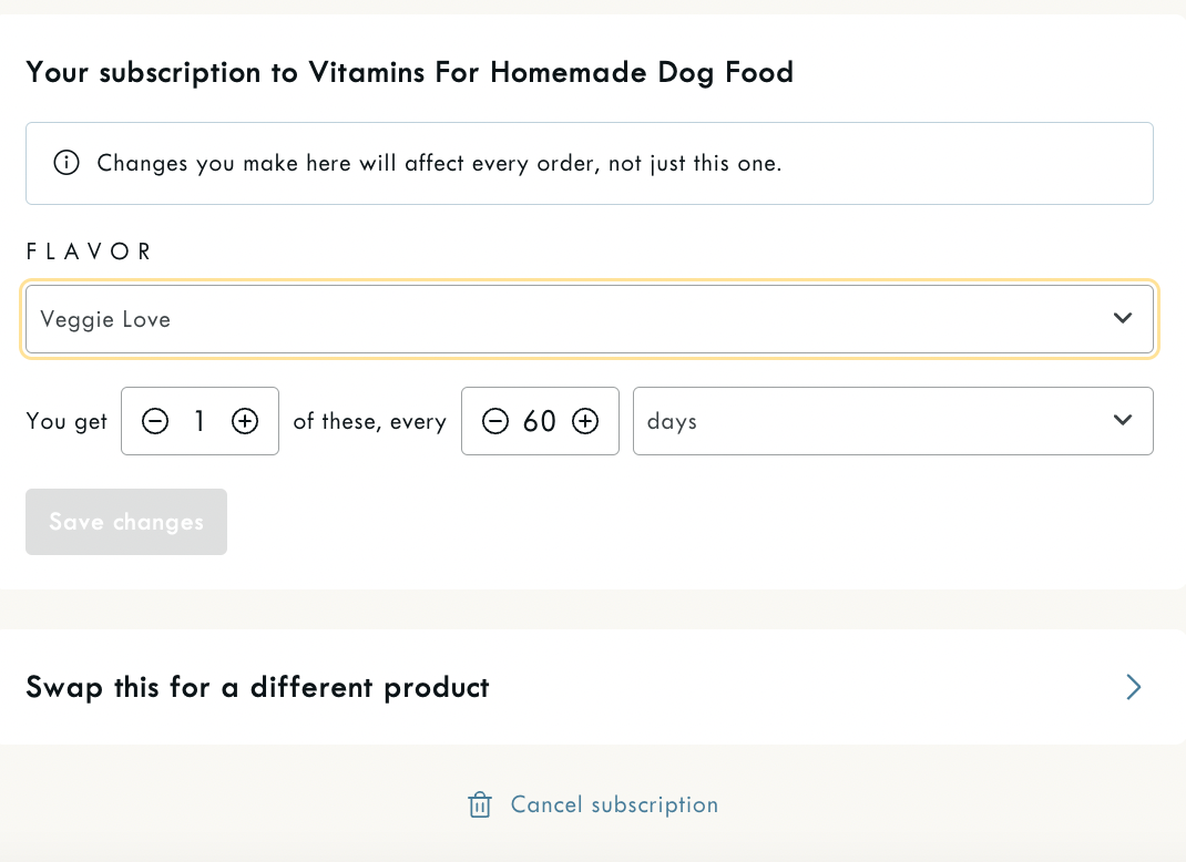 - You can change the quantity of products and frequency, then select Save changes to confirm